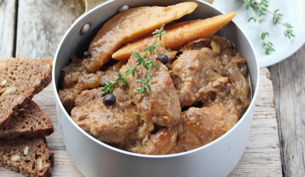 Нарежете месото и го запържете в горещото масло с нарязания на филийки лук. Посолете и пържете до пълното омекване на лука. Поръсете с малко брашно и червен пипер, долейте вода и варете до полуомеква...