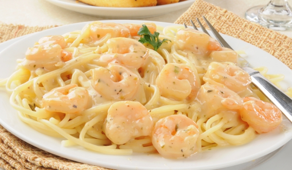 Чесънът и лукът се режат на ситно и се запържват в маслото 2 минути. Добавят се почистените скариди и се пържат 3 минути. Добавя се сол и сметана. Всичко завира и се добавя магданозът. Котлонът се из...