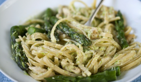 Спагетите се сваряват. Измиват се със студена вода и се отцеждат. Аспержите се счупват на две. Горната част, която е по-мека, се се слага в гореща вода за около 2 минути. Долната част се задушава с л...