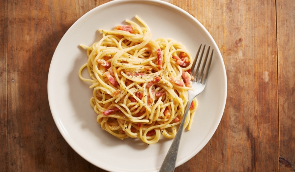 Спагетите се сваряват според инструкциите на опаковката, отцеждат се и се измиват. Беконът (100 г) се нарязва на малки парчета и се за запържва в зехтин (4 с.л.) за няколко минути. Добавя се и счукан...