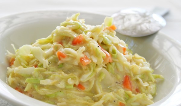 Зелето се измива и се нарязва на съвсем тънки ивички. Посолява се с половината сол и се добавят настърганите на едро ренде моркови и лук. От млякото, майонезата, черния пипер и останалата сол се приг...