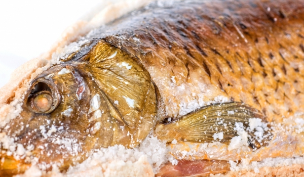 Рибата се измива, изчиства се и се осолява отвътре и отвън. Покрива се плътно от всички страни с листа от бреза. Намазва се с глина и се слага в жар, където се оставя 60 минути. Сервира се с картоф...