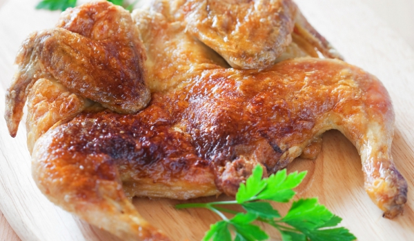 Пилето се разрязва по линията на гръдната кост, разтваря се, обръща се с гърба на горе и се сплесква, като се притисква. Натърква се със сол и черен пипер. Маслото се разтопява в голям тиган, в него...