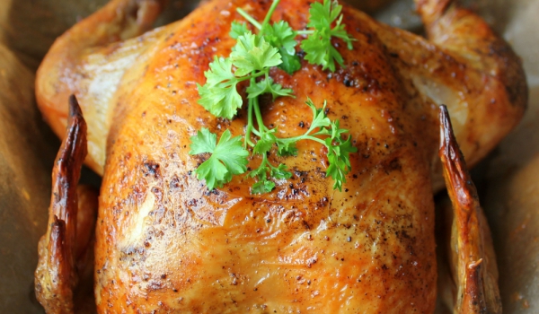 Пилето се измива, внимателно се повдига кожата и месото се натрива със сол отвън и отвътре. Магданозът се намачква леко и заедно с розмарина се натъпква в пилето. Лимонът се измива добре и се нарязва...