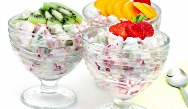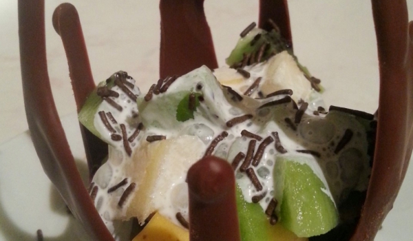 Почиствате кивитата и ги нарязвате на кубчета. Обелете бананите и ги нарежете на кръгчета. Ананаса го нарязвате на дребно, и гроздовите зърна ги нарязвате наполовина ако са големи, ако са малки си ст...